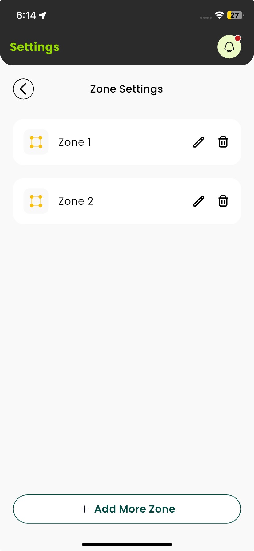 Delete ZonesUpdated 2 hours ago Zone DeletedThe user removed a zone that was previously added. Details:The selected zone has been successfully deleted from your controller setup.You can add a new zone anytime from the “Add Zone” section. Was this article helpful? YesNoDelete ZonesDetails: